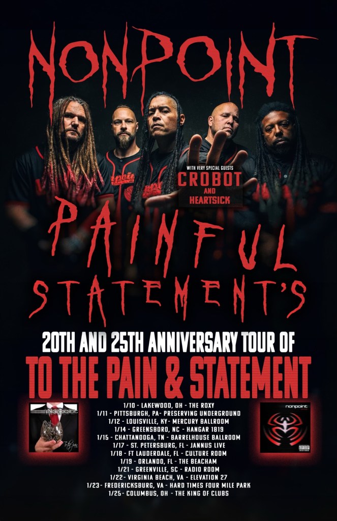 Nonpoint will be playing a handful of shows in January 2025, celebrating the 20th anniversary of To The Pain and the 25th anniversary of Statement. With special guests Crobot and Heartsick, this month-long run kicks off January 10th in Lakewood, Ohio. Tickets and VIP are now on sale at nonpoint.com!