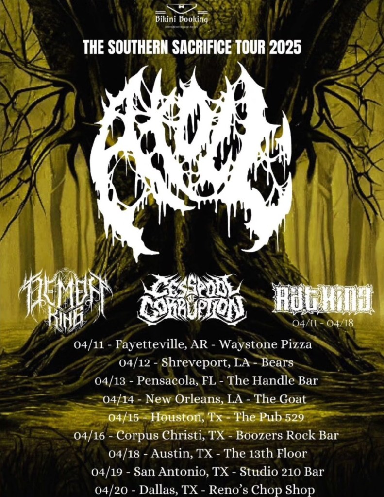 The carnage kicks off in Fayetteville, AR, at Waystone Pizza on April 11, before ripping through Shreveport, Pensacola, New Orleans, Houston, Corpus Christi, Austin, San Antonio, and culminating in a Texas-sized finale at Reno’s Chop Shop in Dallas on April 20. Fans can expect a setlist stacked with pit-inducing slams, relentless brutality, and raw energy, drawing from their decade-long discography, including Prepuce (2022), Human Extract (2023), and Inhuman Implants (2024).