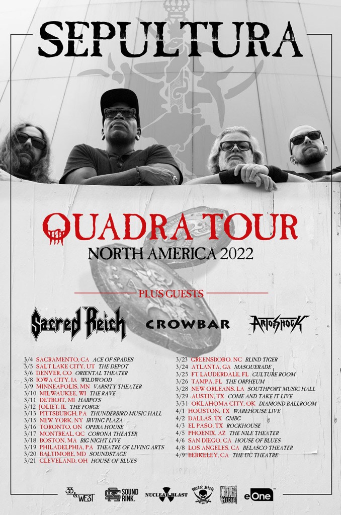 New Orleans sludge metal behemoths CROWBAR will support Sepultura and SacredReich on their long-anticipated tour next Spring. Initially scheduled as a 2020 run, the North America Quadra Tour 2022 kicks off March 4th in Sacramento, California and makes its way through a month’s worth of shows, ending on April 9th in Berkeley California. Additional support will be provided by Art Of Shock. All tickets previously purchased for the 2020 dates, will be honored.