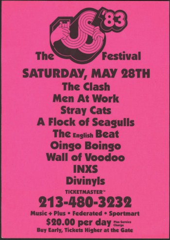 Among the very many performers spanning the entire festival were: Van Halen, David Bowie, The Clash, Joe Walsh, The Pretenders, Ozzy Osbourne, Judas Priest, Scorpions, Triumph, Mötley Crüe, Quiet Riot, U2, Missing Persons, Stray Cats, INXS, and Stevie Nicks. Amazing!! By the way, I was 17 years old in ’83. Whoa.