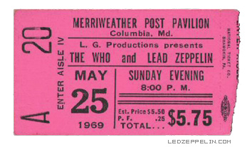 On May 25th, 1969 – The Who and Led Zeppelin performed on the same bill for the only time in Rock History, at the Merriweather Post Pavilion in Columbia, Maryland, USA. Led Zeppelin opened for The Who, by the way. Whoa, man! Check out the ticket prices (above) for this unbelievable historic event!! OMFG!! Notice on the ticket stub (above) the misspelling of Led Zeppelin. LOL!! This is an event that I would go to in my time machine; if I had a time machine, that is. I NEED a time machine! Now!! Who is with me?!